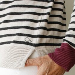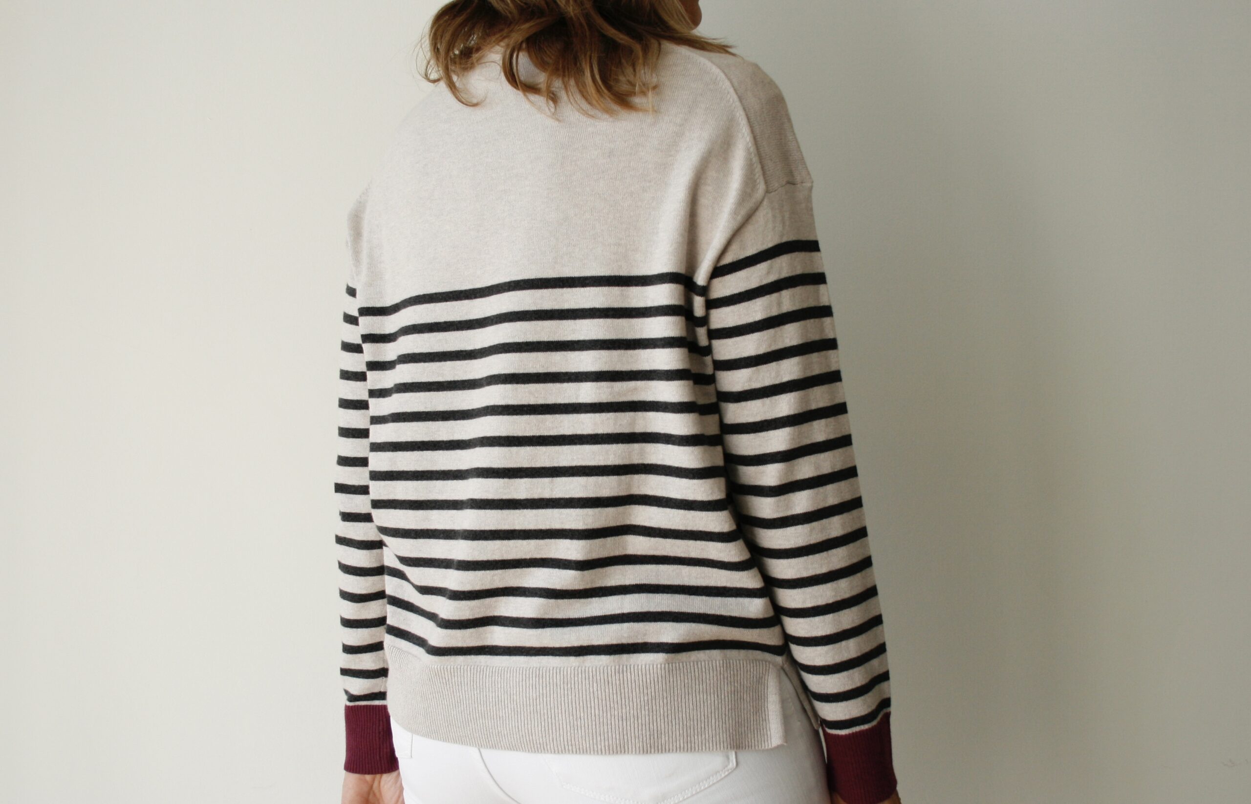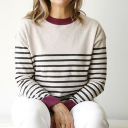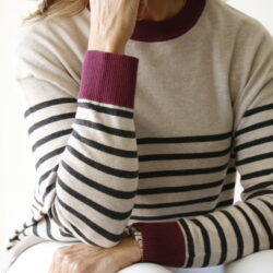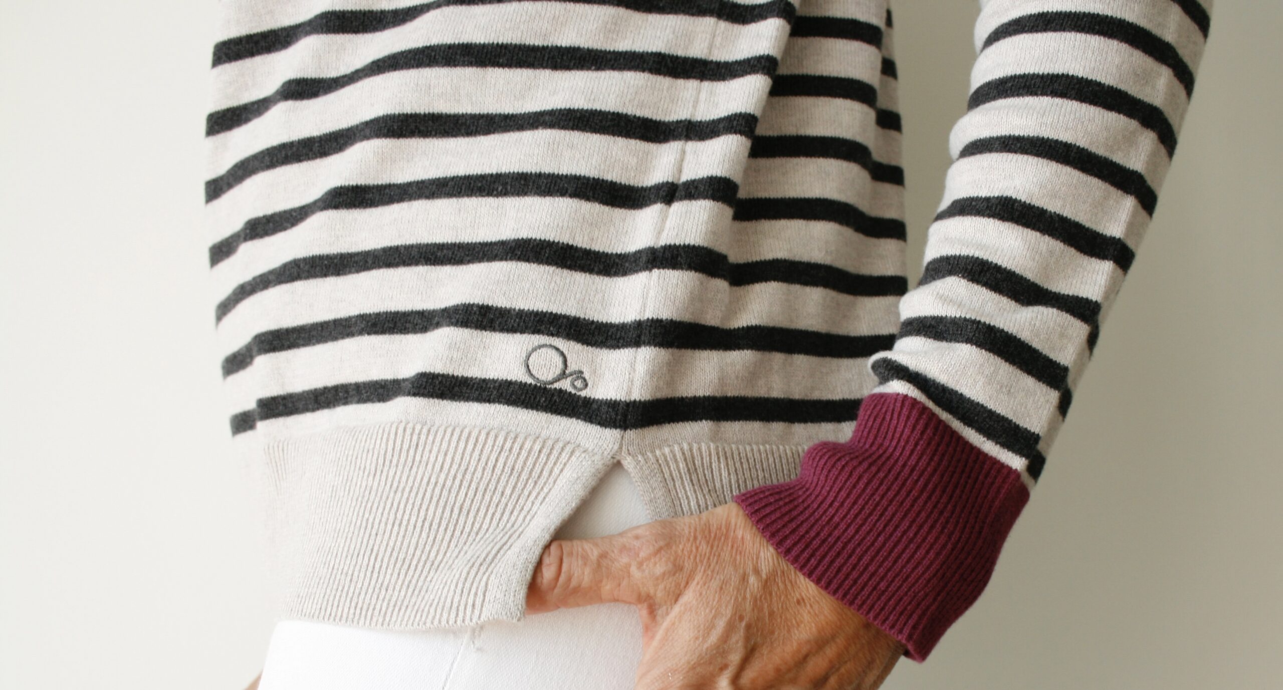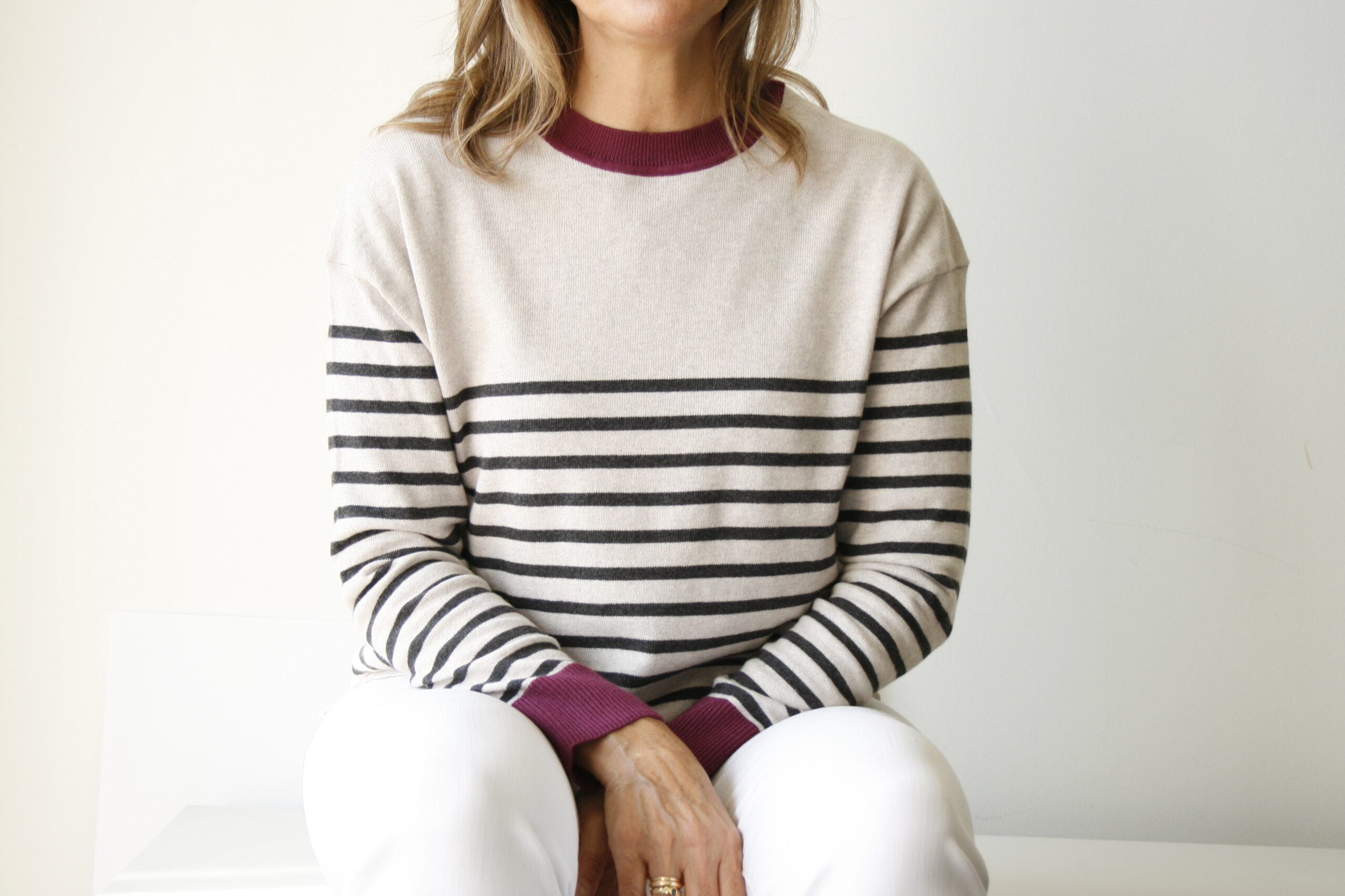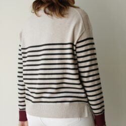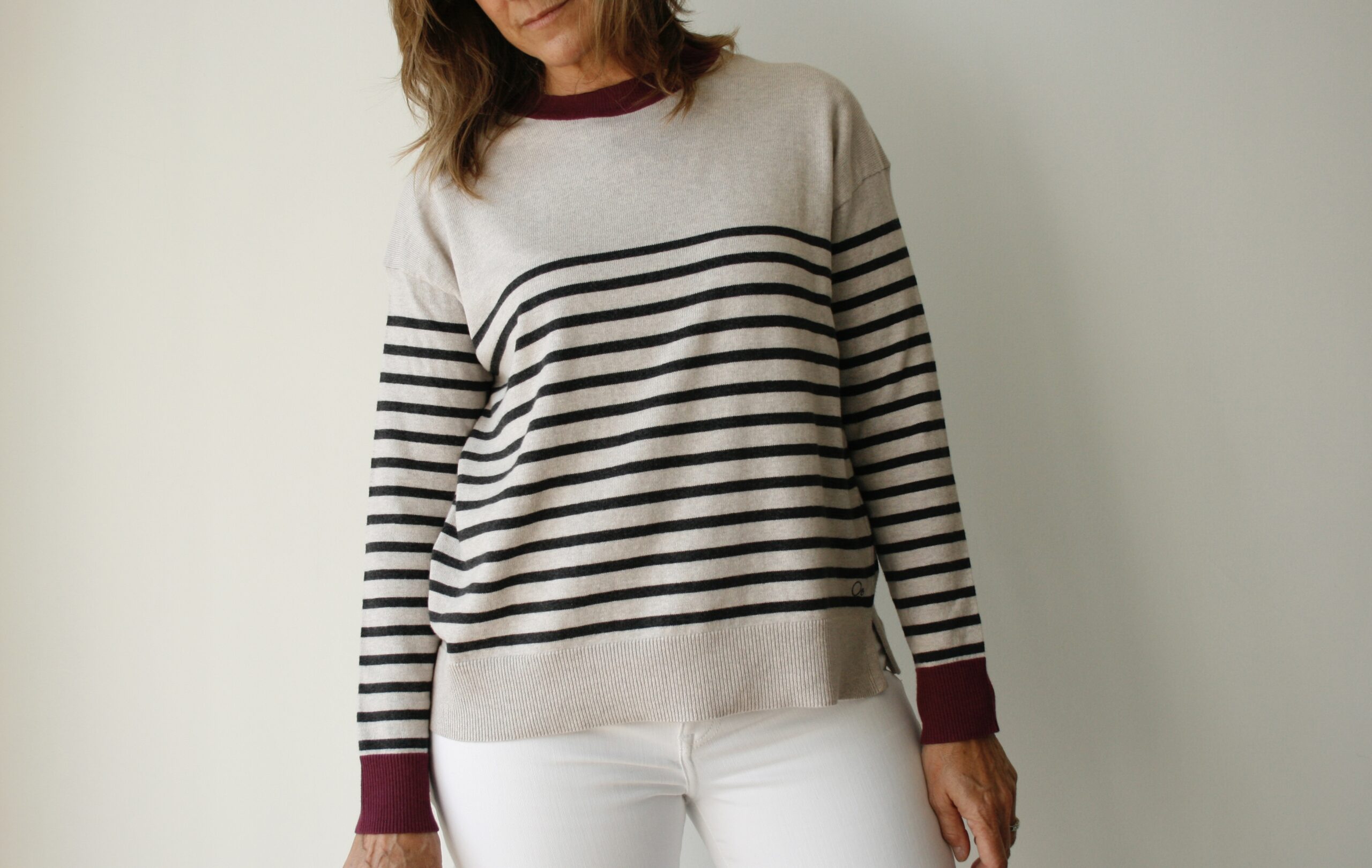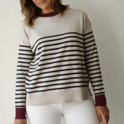 Edición limitada. Jersey de mujer cuello redondo con rayas bicolor y aberturas laterales, manga larga con acabado canalé en bajo y puños. Detalle de logo bordado en el bajo con puño y cuello en contraste. Tacto suave y grosor fino válido para cualquier época del año.